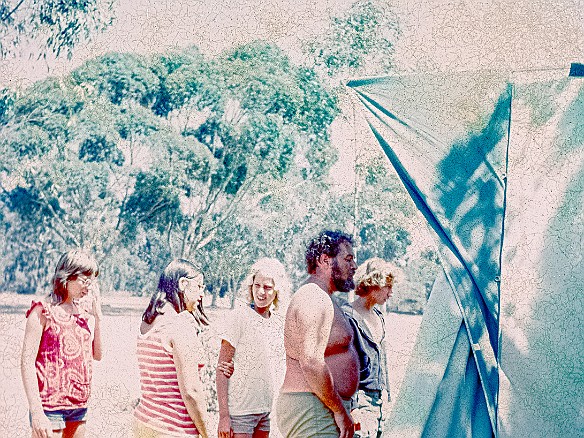 9 During Christmas vacation 1973 we flew back to California to visit with friends and go camping at San Clemente State Beach. Deb helping put up one of the tents.