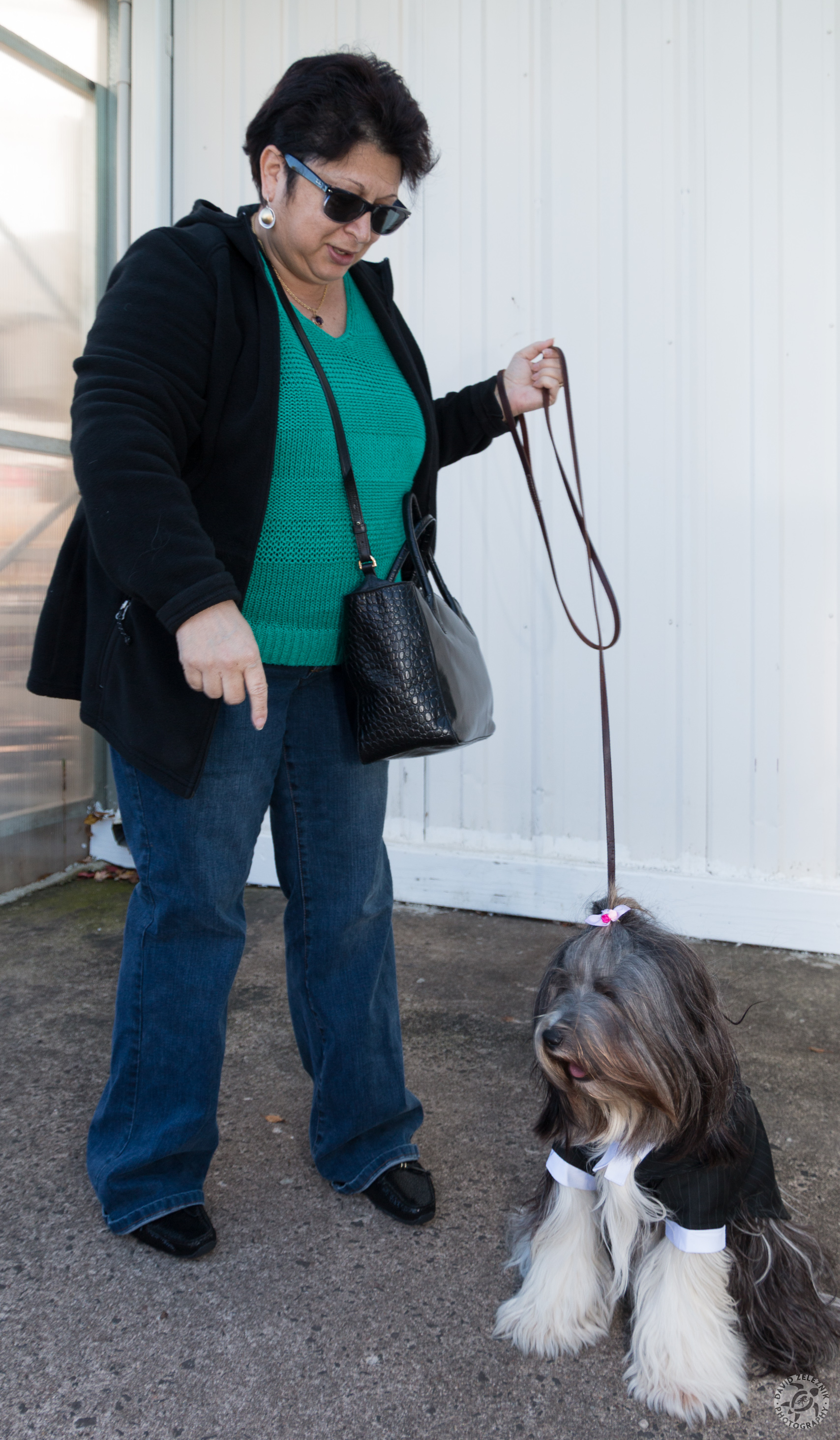 Our local Agway was having a Halloween costume contest for pets on a Saturday towards the beginning of October. Max gets Sophie outfitted in her tuxedo outside the store.