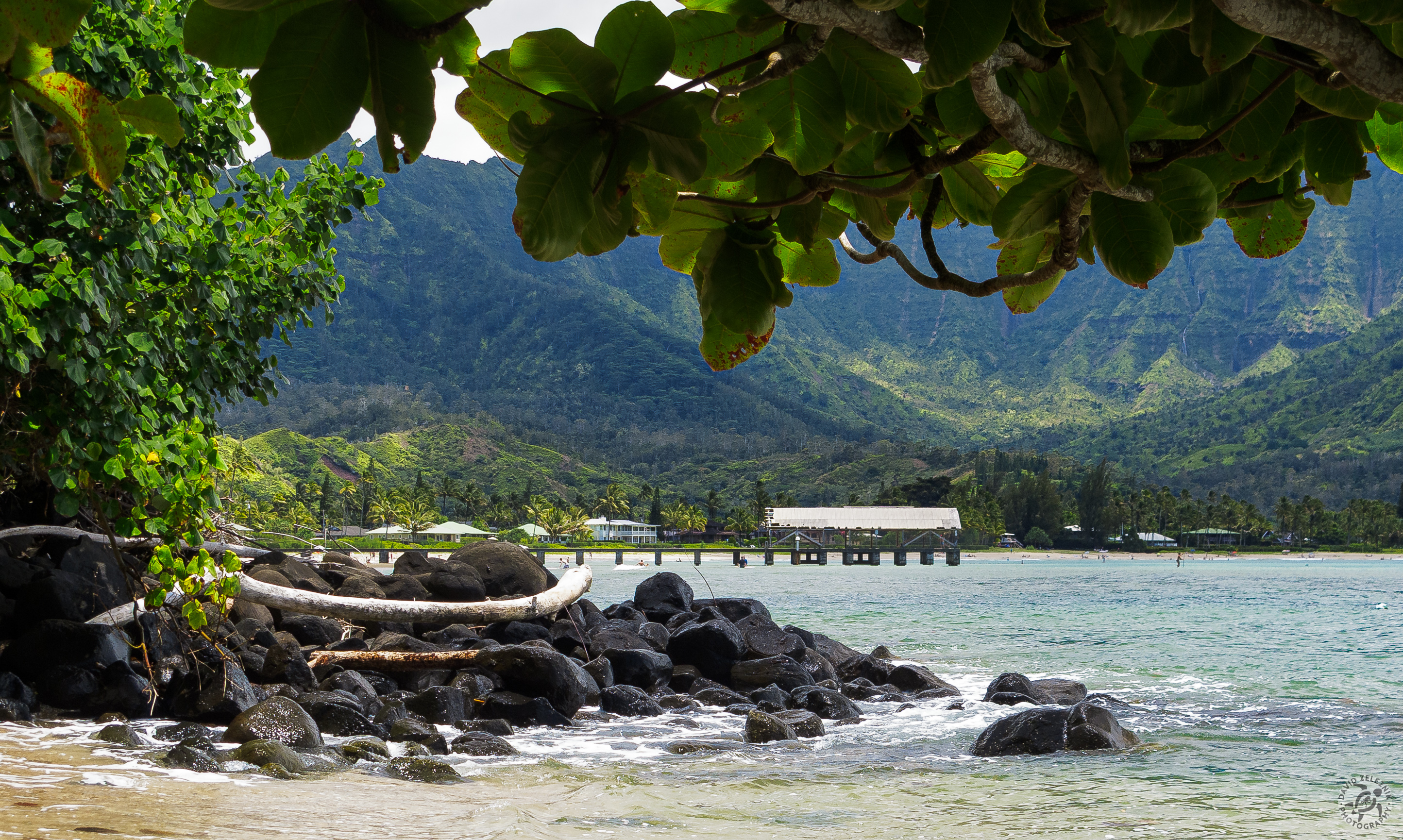 We stumble along the rocky shore, crossing streams, and tripping on roots of trees that Stan cannot identify. Meanwhile, Stan runs backwards in front of us, clapping his hands like a drill sergeant for us to keep up. This is a view of the historic Hanalei pier as we stumble among the shoreline brush to find the path up the bluff to the old resort area. May 16, 2012 1:00 PM