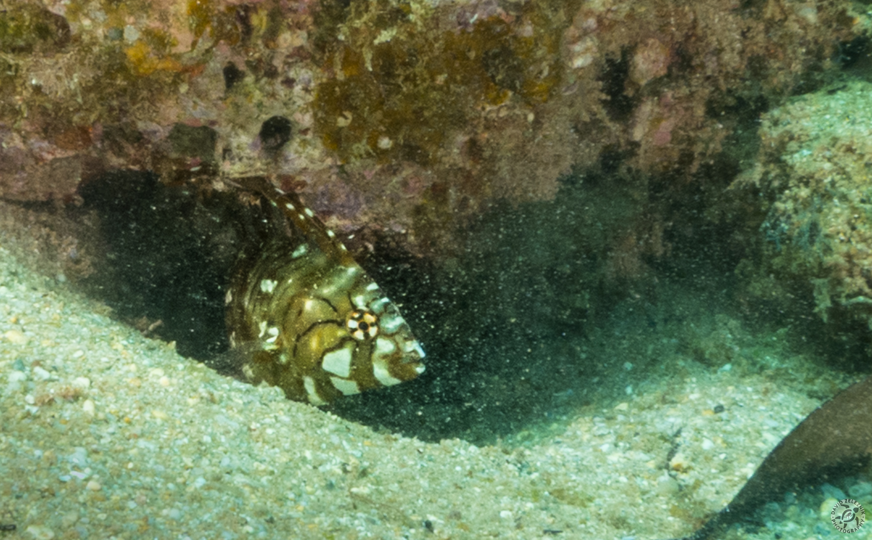 This guy is a juvenile rockmover wrasse, sometimes called a dragon wrasse because they look so completely different than the adult. He was always found around the same outcropping and would scoot under as soon as we got anywhere close. This was the only photo I was able to capture.