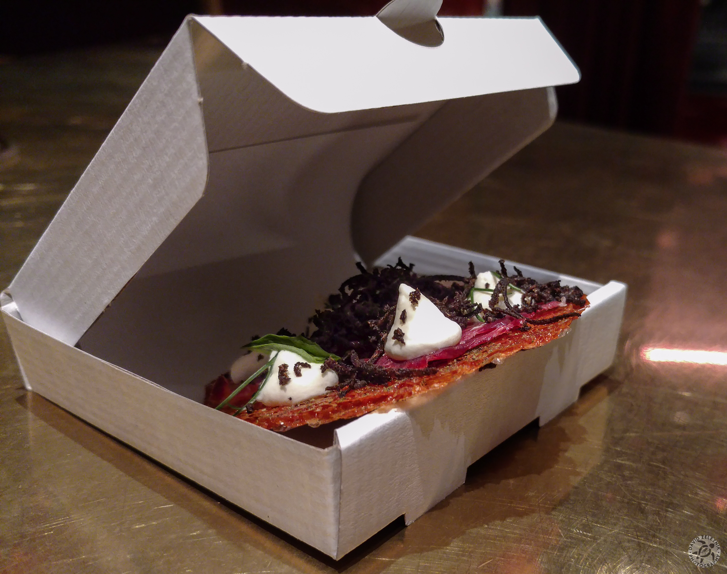 "Spanish Pizza" was some kind of cheese wafer topped with Iberico ham, cheese foam, and shaved truffles. Of course, it was served in little miniature pizza boxes.