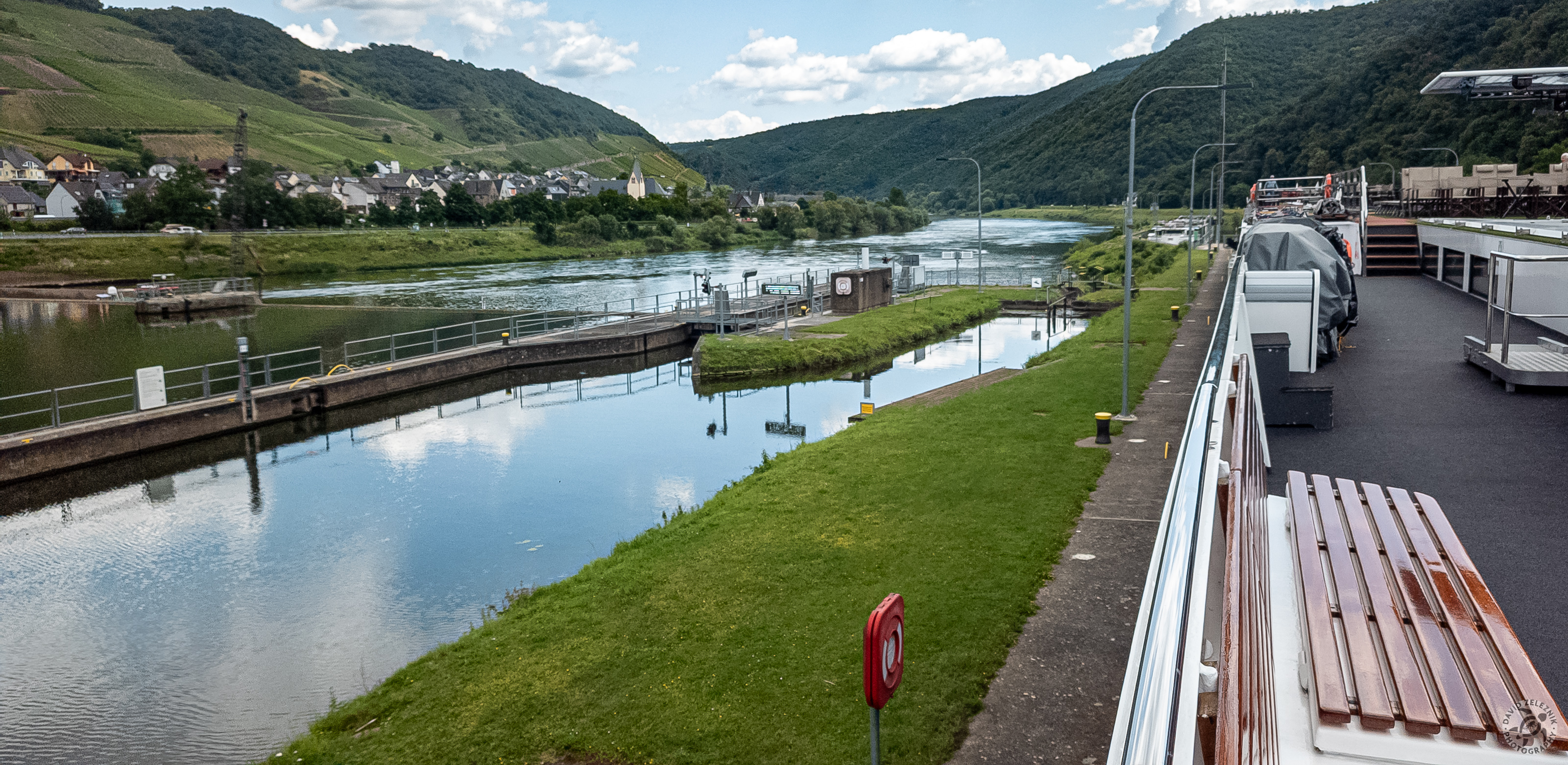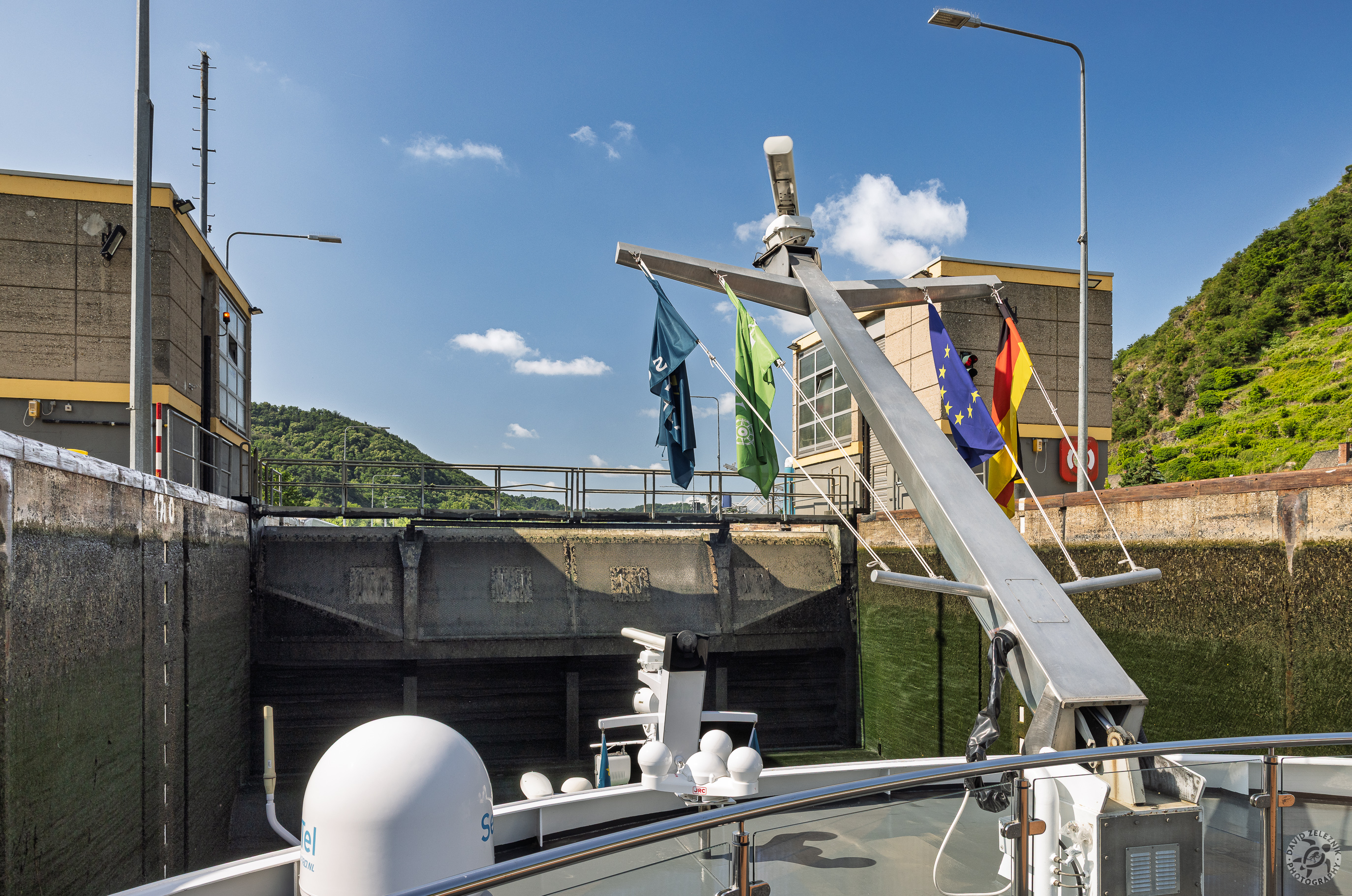 4 The view of the Lehman lock as we pass through gives the general layout of all the locks on the Moselle. The lock itself is along one bank, in the middle are…